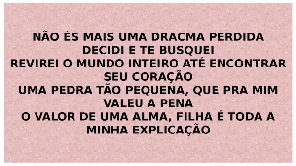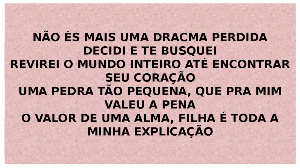 - NÃO ÉS MAIS UMA DRACMA PERDIDADECIDI E TE BUSQUEIREVIREI O MUNDO INTEIRO ATÉ ENCONTRAR SEU CORAÇÃOUMA PEDRA TÃO PEQUENA, QUE PRA MIM VALEU A PENAO VALOR DE UMA ALMA, FILHA É TODA A MINHA EXPLICAÇÃO