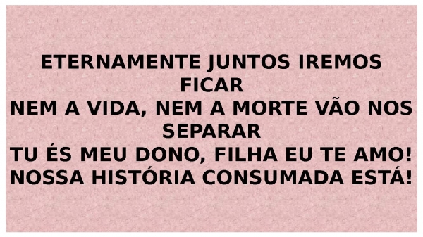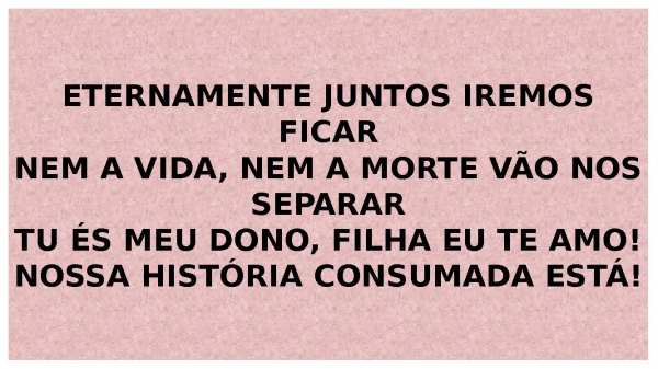 - ETERNAMENTE JUNTOS IREMOS FICARNEM A VIDA, NEM A MORTE VÃO NOS SEPARARTU ÉS MEU DONO, FILHA EU TE AMO!NOSSA HISTÓRIA CONSUMADA ESTÁ!