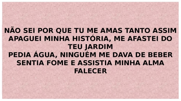 - NÃO SEI POR QUE TU ME AMAS TANTO ASSIMAPAGUEI MINHA HISTÓRIA, ME AFASTEI DO TEU JARDIMPEDIA ÁGUA, NINGUÉM ME DAVA DE BEBERSENTIA FOME E ASSISTIA MINHA ALMA FALECER
