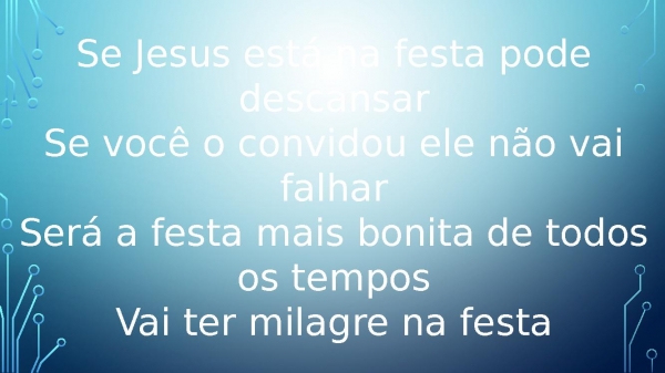 - Se Jesus está na festa pode descansarSe você o convidou ele não vai falharSerá a festa mais bonita de todos os temposVai ter milagre na festa