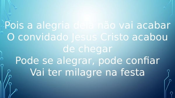 - Pois a alegria dela não vai acabarO convidado Jesus Cristo acabou de chegarPode se alegrar, pode confiarVai ter milagre na festa