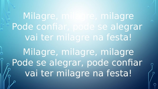 - Milagre, milagre, milagrePode confiar, pode se alegrar vai ter milagre na festa! Milagre, milagre, milagrePode se alegrar, pode confiar vai ter milagre na festa!