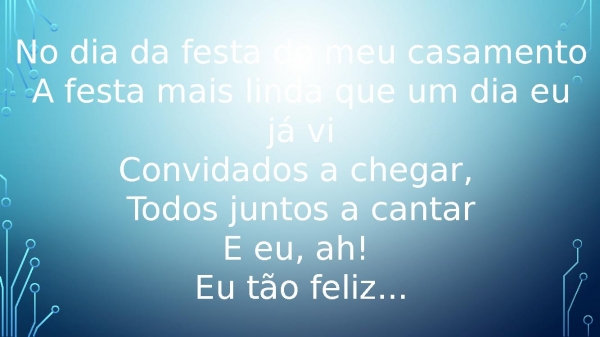 - No dia da festa do meu casamentoA festa mais linda que um dia eu já viConvidados a chegar, Todos juntos a cantarE eu, ah! Eu tão feliz...
