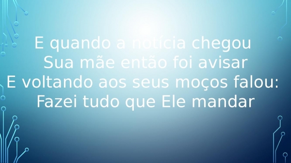 - E quando a notícia chegou Sua mãe então foi avisarE voltando aos seus moços falou: Fazei tudo que Ele mandar