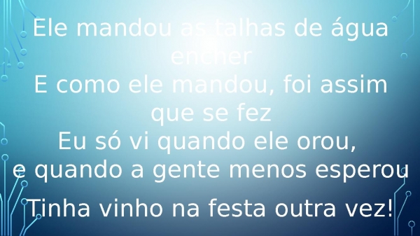 - Ele mandou as talhas de água encherE como ele mandou, foi assim que se fezEu só vi quando ele orou, e quando a gente menos esperou Tinha vinho na festa outra vez!