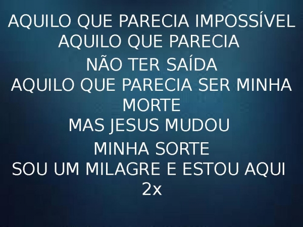 - AQUILO QUE PARECIA IMPOSSÍVELAQUILO QUE PARECIA NÃO TER SAÍDAAQUILO QUE PARECIA SER MINHA MORTEMAS JESUS MUDOU MINHA SORTESOU UM MILAGRE E ESTOU AQUI 2x
