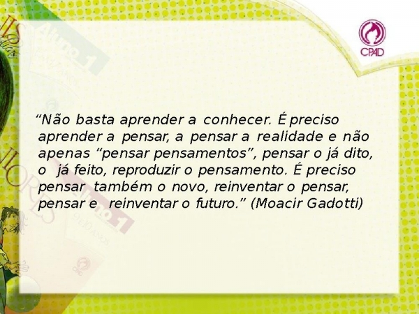 - “Não basta aprender a conhecer. É preciso aprender a pensar, a pensar a realidade e não apenas “pensar pensamentos”, pensar o já dito, o já feito, reproduzir o pensamento. É preciso pensar também o novo, reinventar o pensar, pensar e reinventar o futuro.” (Moacir Gadotti)