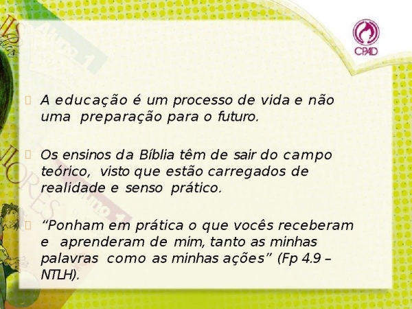 - A educação é um processo de vida e não uma preparação para o futuro.Os ensinos da Bíblia têm de sair do campo teórico, visto que estão carregados de realidade e senso prático.“Ponham em prática o que vocês receberam e aprenderam de mim, tanto as minhas palavras como as minhas ações” (Fp 4.9 – NTLH).