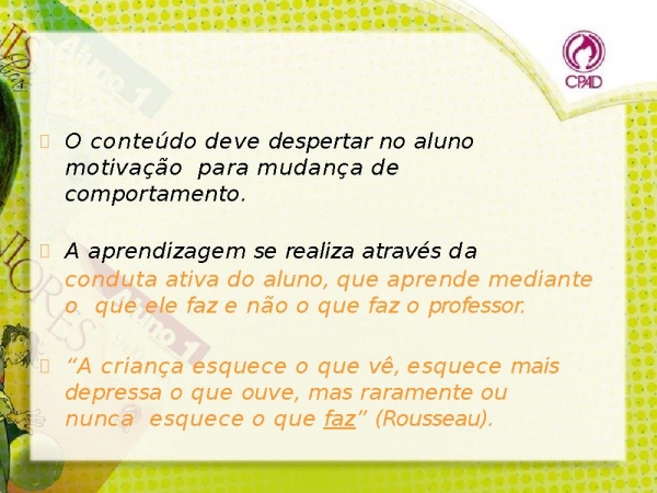 - O conteúdo deve despertar no aluno motivação para mudança de comportamento.A aprendizagem se realiza através daconduta ativa do aluno, que aprende mediante o que ele faz e não o que faz o professor.“A criança esquece o que vê, esquece mais depressa o que ouve, mas raramente ou nunca esquece o que faz” (Rousseau).