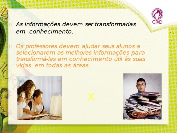 - As informações devem ser transformadas em conhecimento. Os professores devem ajudar seus alunos a selecionarem as melhores informações para transformá-las em conhecimento útil às suas vidas em todas as áreas.X