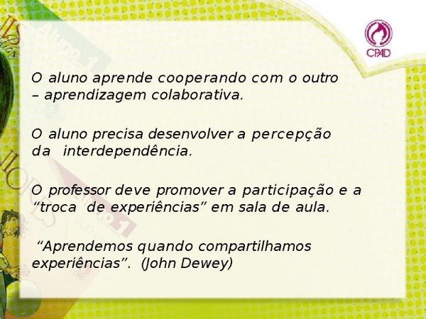 - O aluno aprende cooperando com o outro – aprendizagem colaborativa.O aluno precisa desenvolver a percepção da interdependência.O professor deve promover a participação e a “troca de experiências” em sala de aula.“Aprendemos quando compartilhamos experiências”. (John Dewey)