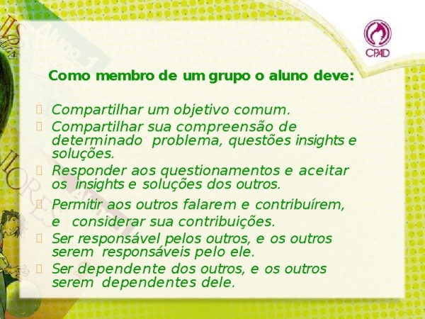 - Como membro de um grupo o aluno deve:Compartilhar um objetivo comum.Compartilhar sua compreensão de determinado problema, questões insights e soluções.Responder aos questionamentos e aceitar os insights e soluções dos outros.Permitir aos outros falarem e contribuírem, e considerar sua contribuições.Ser responsável pelos outros, e os outros serem responsáveis pelo ele.Ser dependente dos outros, e os outros serem dependentes dele.