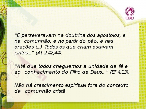 - “E perseveravam na doutrina dos apóstolos, e na comunhão, e no partir do pão, e nas orações (...) Todos os que criam estavam juntos...” (At 2.42,44).“Até que todos cheguemos à unidade da fé e ao conhecimento do Filho de Deus...” (Ef 4.13).Não há crescimento espiritual fora do contexto da comunhão cristã.