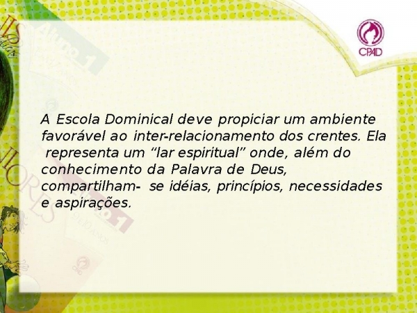 - A Escola Dominical deve propiciar um ambiente favorável ao inter-relacionamento dos crentes. Ela representa um “lar espiritual” onde, além do conhecimento da Palavra de Deus, compartilham- se idéias, princípios, necessidades e aspirações.