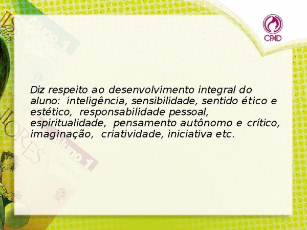 - Diz respeito ao desenvolvimento integral do aluno: inteligência, sensibilidade, sentido ético e estético, responsabilidade pessoal, espiritualidade, pensamento autônomo e crítico, imaginação, criatividade, iniciativa etc.