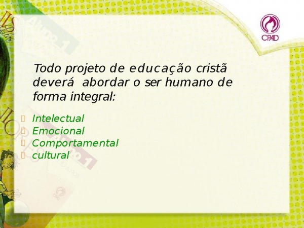- Todo projeto de educação cristã deverá abordar o ser humano de forma integral:IntelectualEmocionalComportamentalcultural