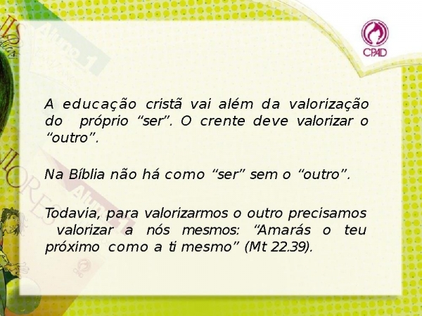 - A educação cristã vai além da valorização do próprio “ser”. O crente deve valorizar o “outro”.Na Bíblia não há como “ser” sem o “outro”.Todavia, para valorizarmos o outro precisamos valorizar a nós mesmos: “Amarás o teu próximo como a ti mesmo” (Mt 22.39).