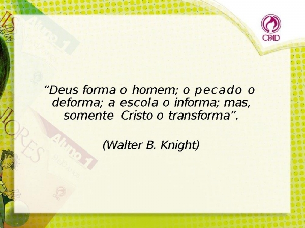 - “Deus forma o homem; o pecado o deforma; a escola o informa; mas, somente Cristo o transforma”.(Walter B. Knight)