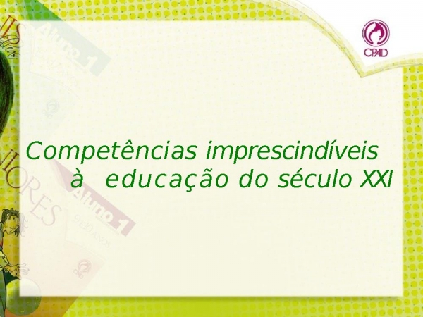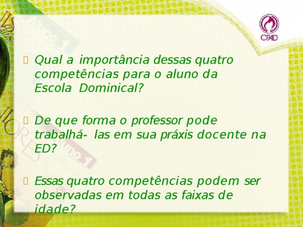 - Qual a importância dessas quatro competências para o aluno da Escola Dominical?De que forma o professor pode trabalhá- las em sua práxis docente na ED?Essas quatro competências podem ser observadas em todas as faixas de idade?