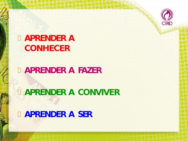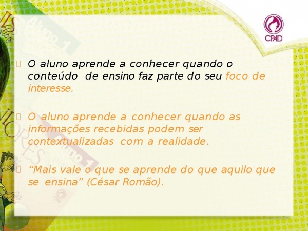 - O aluno aprende a conhecer quando o conteúdo de ensino faz parte do seu foco de interesse.O aluno aprende a conhecer quando as informações recebidas podem ser contextualizadas com a realidade.“Mais vale o que se aprende do que aquilo que se ensina” (César Romão).