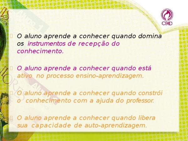 - O aluno aprende a conhecer quando domina os instrumentos de recepção do conhecimento.O aluno aprende a conhecer quando está ativo no processo ensino-aprendizagem.O aluno aprende a conhecer quando constrói o conhecimento com a ajuda do professor.O aluno aprende a conhecer quando libera sua capacidade de auto-aprendizagem.
