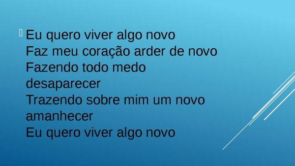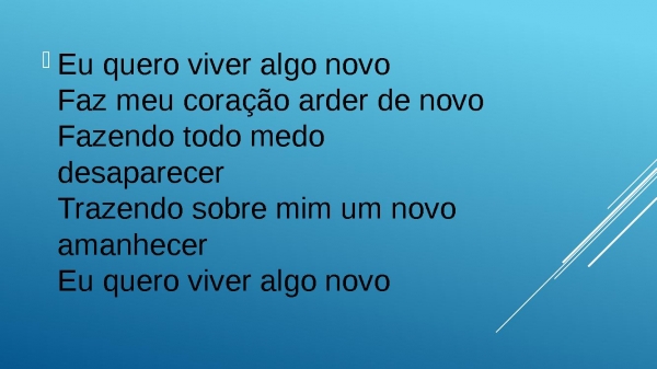 - Eu quero viver algo novoFaz meu coração arder de novoFazendo todo medo desaparecerTrazendo sobre mim um novo amanhecerEu quero viver algo novo