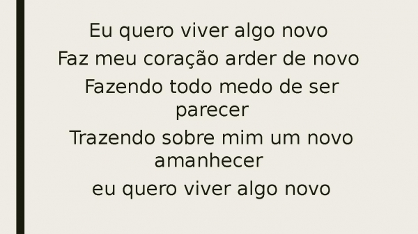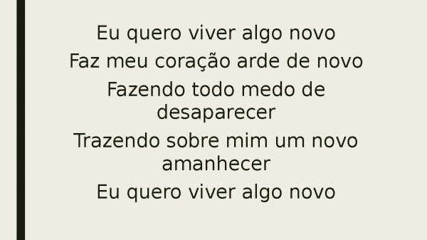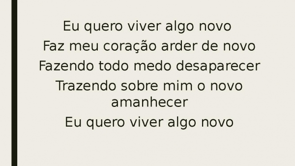 - Eu quero viver algo novoFaz meu coração arde de novoFazendo todo medo de desaparecerTrazendo sobre mim um novo amanhecerEu quero viver algo novo