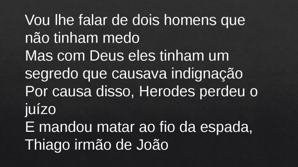 - Vou lhe falar de dois homens que não tinham medoMas com Deus eles tinham um segredo que causava indignaçãoPor causa disso, Herodes perdeu o juízoE mandou matar ao fio da espada, Thiago irmão de João