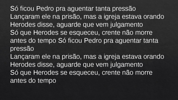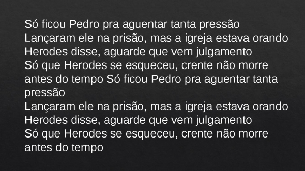 - Só ficou Pedro pra aguentar tanta pressãoLançaram ele na prisão, mas a igreja estava orandoHerodes disse, aguarde que vem julgamentoSó que Herodes se esqueceu, crente não morre antes do tempo Só ficou Pedro pra aguentar tanta pressãoLançaram ele na prisão, mas a igreja estava orandoHerodes disse, aguarde que vem julgamentoSó que Herodes se esqueceu, crente não morre antes do tempo