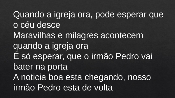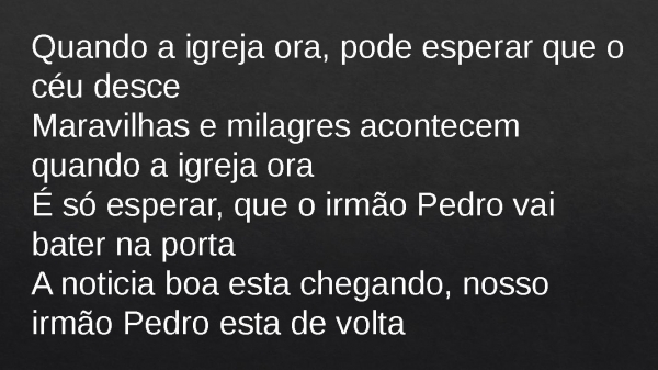- Quando a igreja ora, pode esperar que o céu desceMaravilhas e milagres acontecem quando a igreja oraÉ só esperar, que o irmão Pedro vai bater na portaA noticia boa esta chegando, nosso irmão Pedro esta de volta