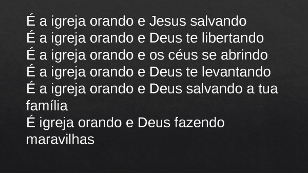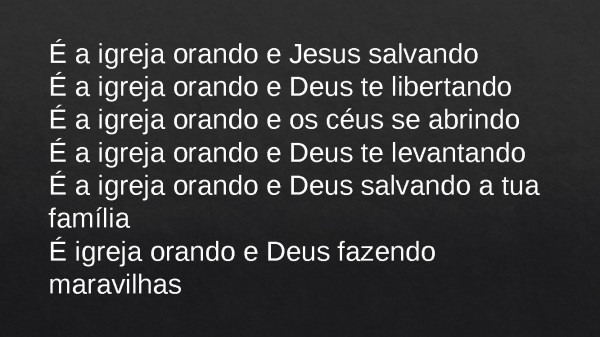 - É a igreja orando e Jesus salvandoÉ a igreja orando e Deus te libertandoÉ a igreja orando e os céus se abrindoÉ a igreja orando e Deus te levantandoÉ a igreja orando e Deus salvando a tua famíliaÉ igreja orando e Deus fazendo maravilhas