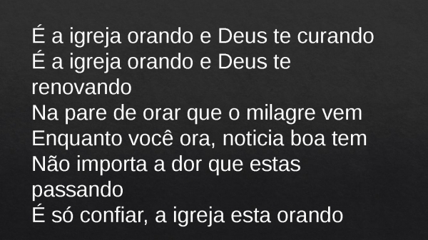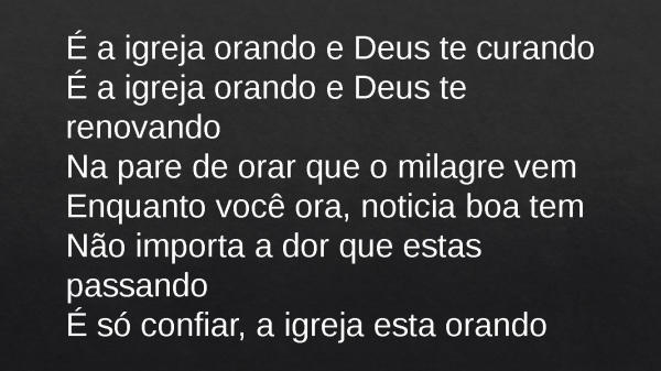- É a igreja orando e Deus te curandoÉ a igreja orando e Deus te renovandoNa pare de orar que o milagre vemEnquanto você ora, noticia boa temNão importa a dor que estas passandoÉ só confiar, a igreja esta orando
