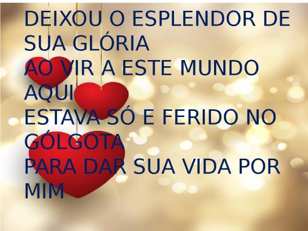 - DEIXOU O ESPLENDOR DE SUA GLÓRIAAO VIR A ESTE MUNDO AQUIESTAVA SÓ E FERIDO NO GÓLGOTAPARA DAR SUA VIDA POR MIM