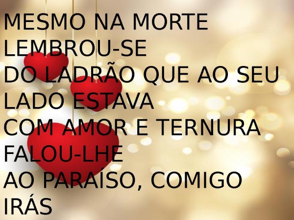 - MESMO NA MORTE LEMBROU-SEDO LADRÃO QUE AO SEU LADO ESTAVACOM AMOR E TERNURA FALOU-LHEAO PARAÍSO, COMIGO IRÁS