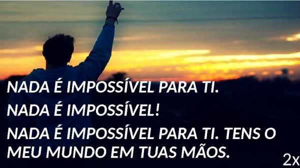 - NADA É IMPOSSÍVEL PARA TI.NADA É IMPOSSÍVEL!NADA É IMPOSSÍVEL PARA TI. TENS O MEU MUNDO EM TUAS MÃOS.2x