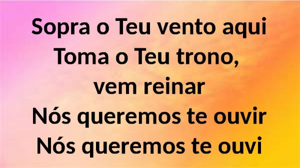 - Sopra o Teu vento aquiToma o Teu trono, vem reinarNós queremos te ouvirNós queremos te ouvi