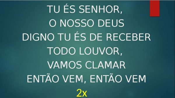 - TU ÉS SENHOR, O NOSSO DEUSDIGNO TU ÉS DE RECEBERTODO LOUVOR, VAMOS CLAMARENTÃO VEM, ENTÃO VEM2x