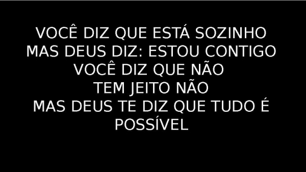 - VOCÊ DIZ QUE ESTÁ SOZINHOMAS DEUS DIZ: ESTOU CONTIGOVOCÊ DIZ QUE NÃO TEM JEITO NÃOMAS DEUS TE DIZ QUE TUDO É POSSÍVEL