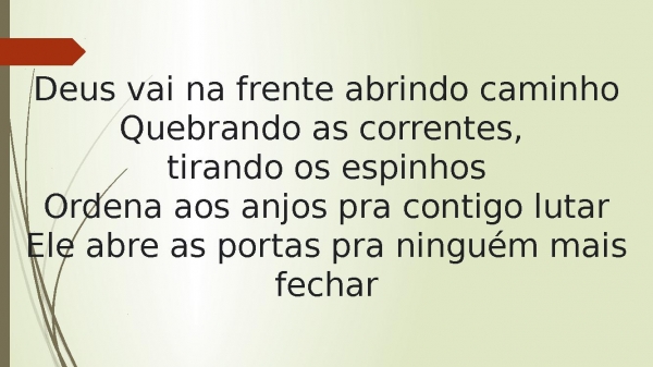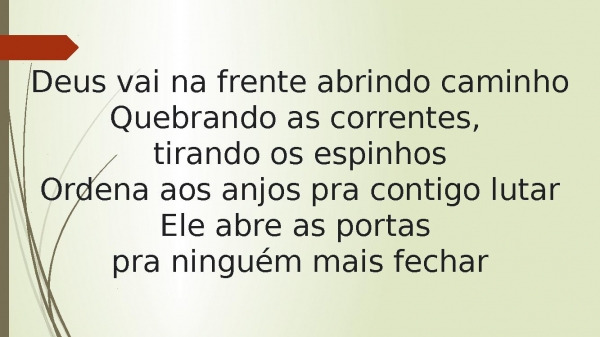 - Deus vai na frente abrindo caminhoQuebrando as correntes, tirando os espinhosOrdena aos anjos pra contigo lutarEle abre as portas pra ninguém mais fechar