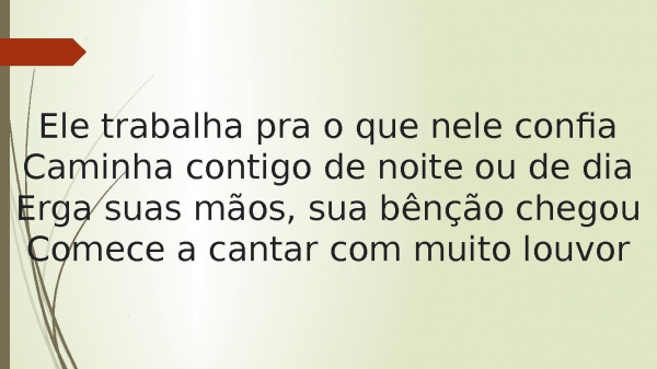 - Ele trabalha pra o que nele confiaCaminha contigo de noite ou de diaErga suas mãos, sua bênção chegouComece a cantar com muito louvor