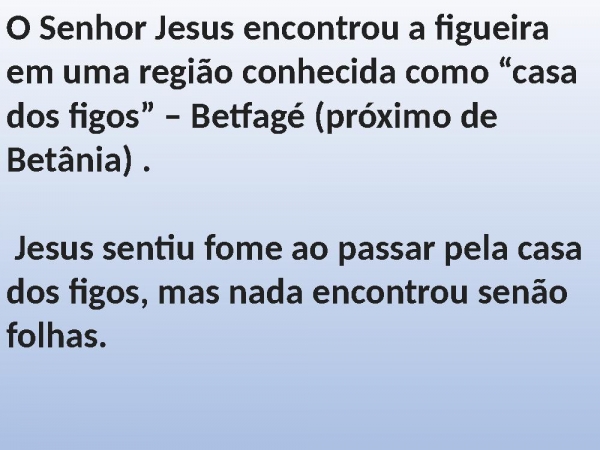 - O Senhor Jesus encontrou a figueira em uma região conhecida como “casa dos figos” – Betfagé (próximo de Betânia) . Jesus sentiu fome ao passar pela casa dos figos, mas nada encontrou senão folhas.