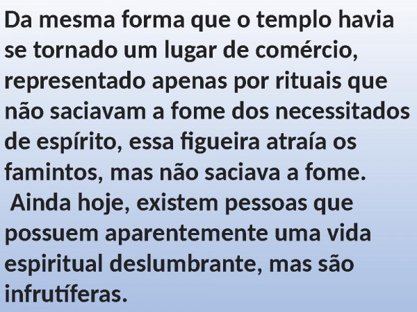 - Da mesma forma que o templo havia se tornado um lugar de comércio, representado apenas por rituais que não saciavam a fome dos necessitados de espírito, essa figueira atraía os famintos, mas não saciava a fome. Ainda hoje, existem pessoas que possuem aparentemente uma vida espiritual deslumbrante, mas são infrutíferas.
