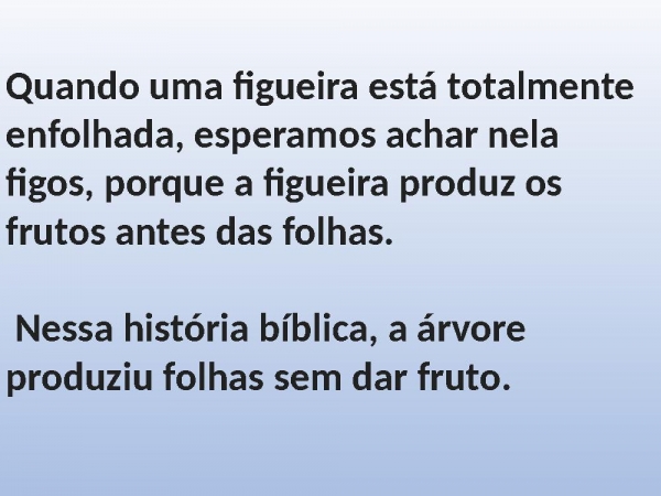 - Quando uma figueira está totalmente enfolhada, esperamos achar nela figos, porque a figueira produz os frutos antes das folhas. Nessa história bíblica, a árvore produziu folhas sem dar fruto.