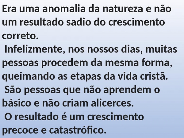 - Era uma anomalia da natureza e não um resultado sadio do crescimento correto. Infelizmente, nos nossos dias, muitas pessoas procedem da mesma forma, queimando as etapas da vida cristã. São pessoas que não aprendem o básico e não criam alicerces. O resultado é um crescimento precoce e catastrófico.