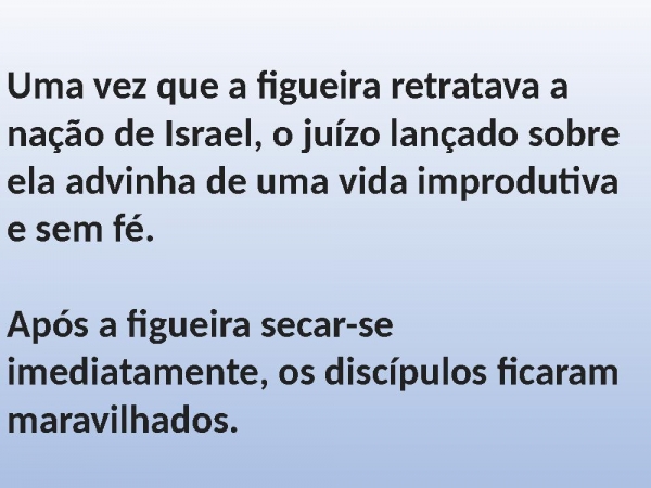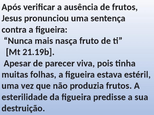 - Após verificar a ausência de frutos, Jesus pronunciou uma sentença contra a figueira: “Nunca mais nasça fruto de ti” [Mt 21.19b]. Apesar de parecer viva, pois tinha muitas folhas, a figueira estava estéril, uma vez que não produzia frutos. A esterilidade da figueira predisse a sua destruição.