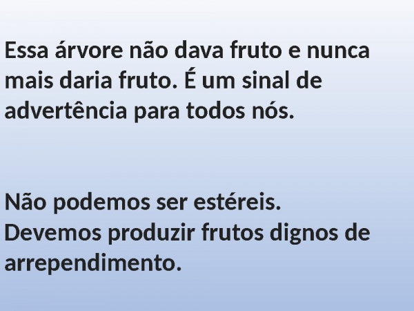 - Essa árvore não dava fruto e nunca mais daria fruto. É um sinal de advertência para todos nós.Não podemos ser estéreis. Devemos produzir frutos dignos de arrependimento.