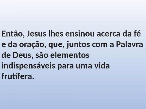 - Então, Jesus lhes ensinou acerca da fé e da oração, que, juntos com a Palavra de Deus, são elementos indispensáveis para uma vida frutífera.
