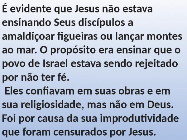 - É evidente que Jesus não estava ensinando Seus discípulos a amaldiçoar figueiras ou lançar montes ao mar. O propósito era ensinar que o povo de Israel estava sendo rejeitado por não ter fé. Eles confiavam em suas obras e em sua religiosidade, mas não em Deus. Foi por causa da sua improdutividade que foram censurados por Jesus.