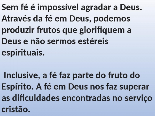 - Sem fé é impossível agradar a Deus. Através da fé em Deus, podemos produzir frutos que glorifiquem a Deus e não sermos estéreis espirituais. Inclusive, a fé faz parte do fruto do Espírito. A fé em Deus nos faz superar as dificuldades encontradas no serviço cristão.