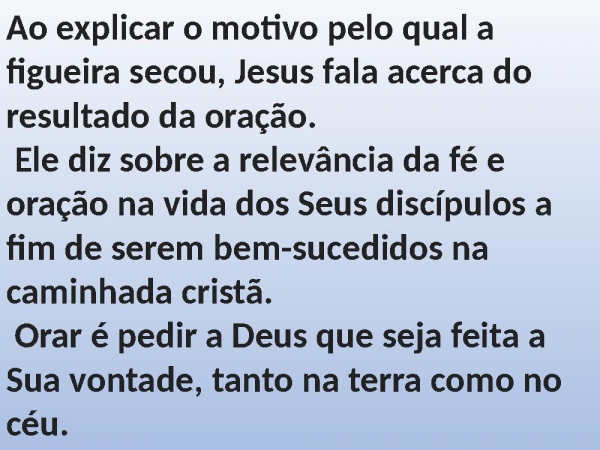 - Ao explicar o motivo pelo qual a figueira secou, Jesus fala acerca do resultado da oração. Ele diz sobre a relevância da fé e oração na vida dos Seus discípulos a fim de serem bem-sucedidos na caminhada cristã. Orar é pedir a Deus que seja feita a Sua vontade, tanto na terra como no céu.